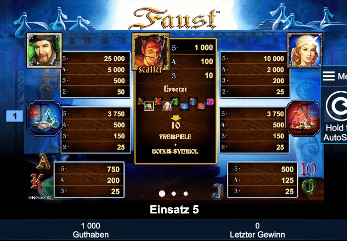 In dem Drama Faust geht es ja darum, dass eben jener Doktor Faust sich mit dem Teufel einlässt um unglaubliches Wissen anzueignen. Ja beinahe magische Fähigkeiten zu erlangen. Doch um in diesem Novoline Spiel zu gewinnen brauchst du keine Zauberei und auch kein großes Wissen. Du musst einfach nur bis zu zehn Gewinnlinien aktivieren und auf jede davon einen Linieneinsatz zwischen vier Cent und zehn Euro bringen.